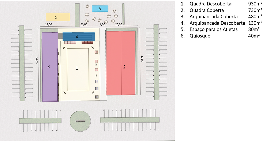 O local conta com quadras e arquibancadas externas e internas, espaço para atletas e um quiosque, atendendo as necessidades esportivas e melhorando a integração entre os usuários.